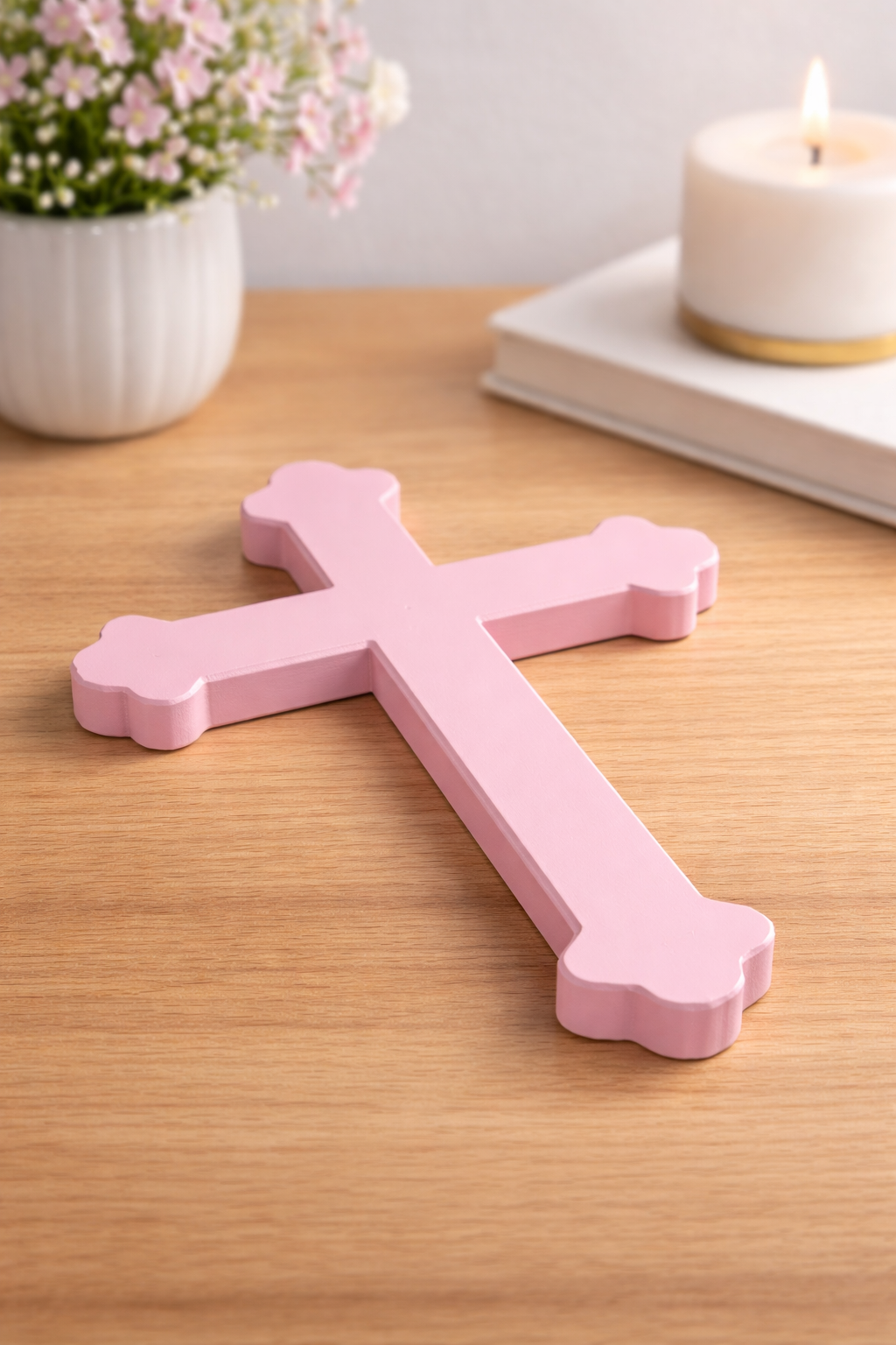 Detta vackert utformade kors är en stilren och tidlös symbol som passar lika bra som dekorativ prydnad i hemmet som för stillhet, bön och reflektion. Den klassiska formen och de mjukt formade ändarna ger korset ett harmoniskt och elegant uttryck som gör att det smälter in i många olika miljöer.