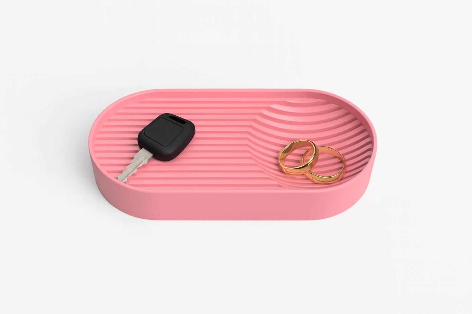 Den ribbade ytan skapar både ett modernt uttryck och ett praktiskt grepp som håller dina saker på plats. Den fördjupade sektionen på sidan är perfekt för mindre värdesaker som ringar, smycken eller mynt, medan den plana delen rymmer allt från nycklar till bilnycklar och andra vardagsprylar.