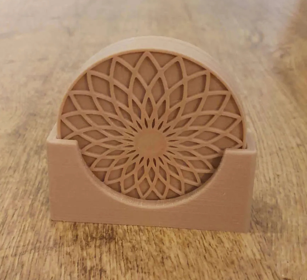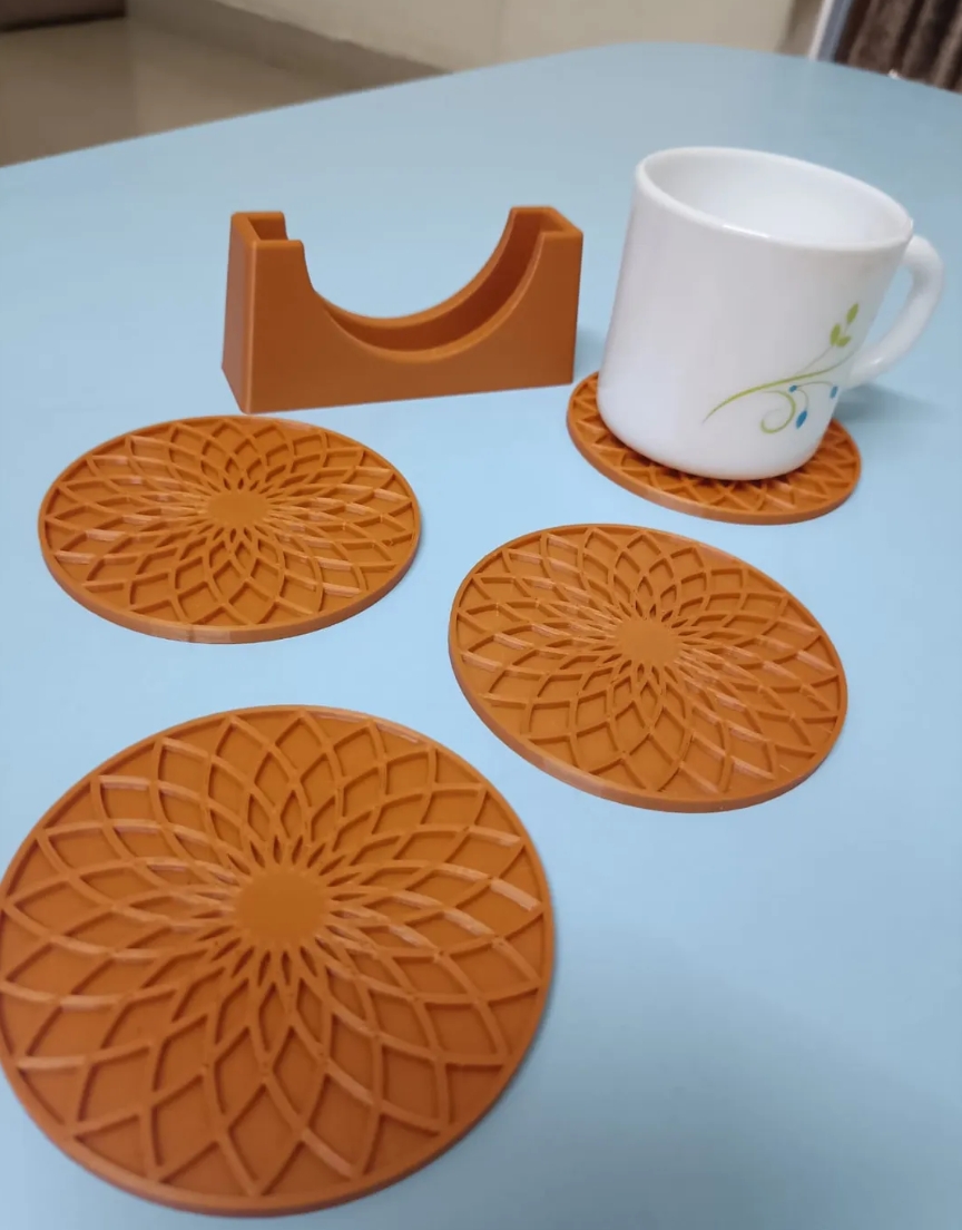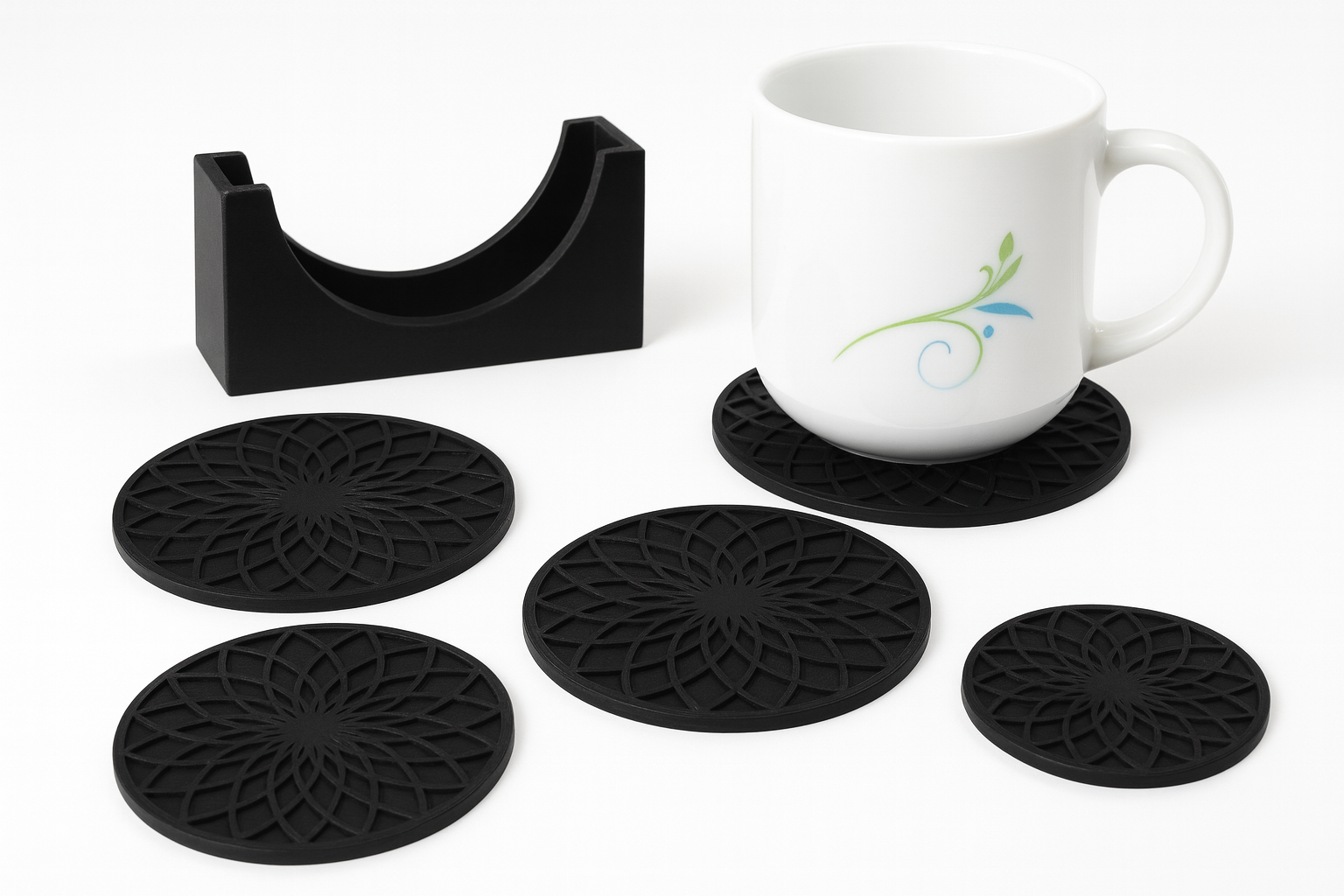 I setet ingår fyra underlägg och en stilren hållare