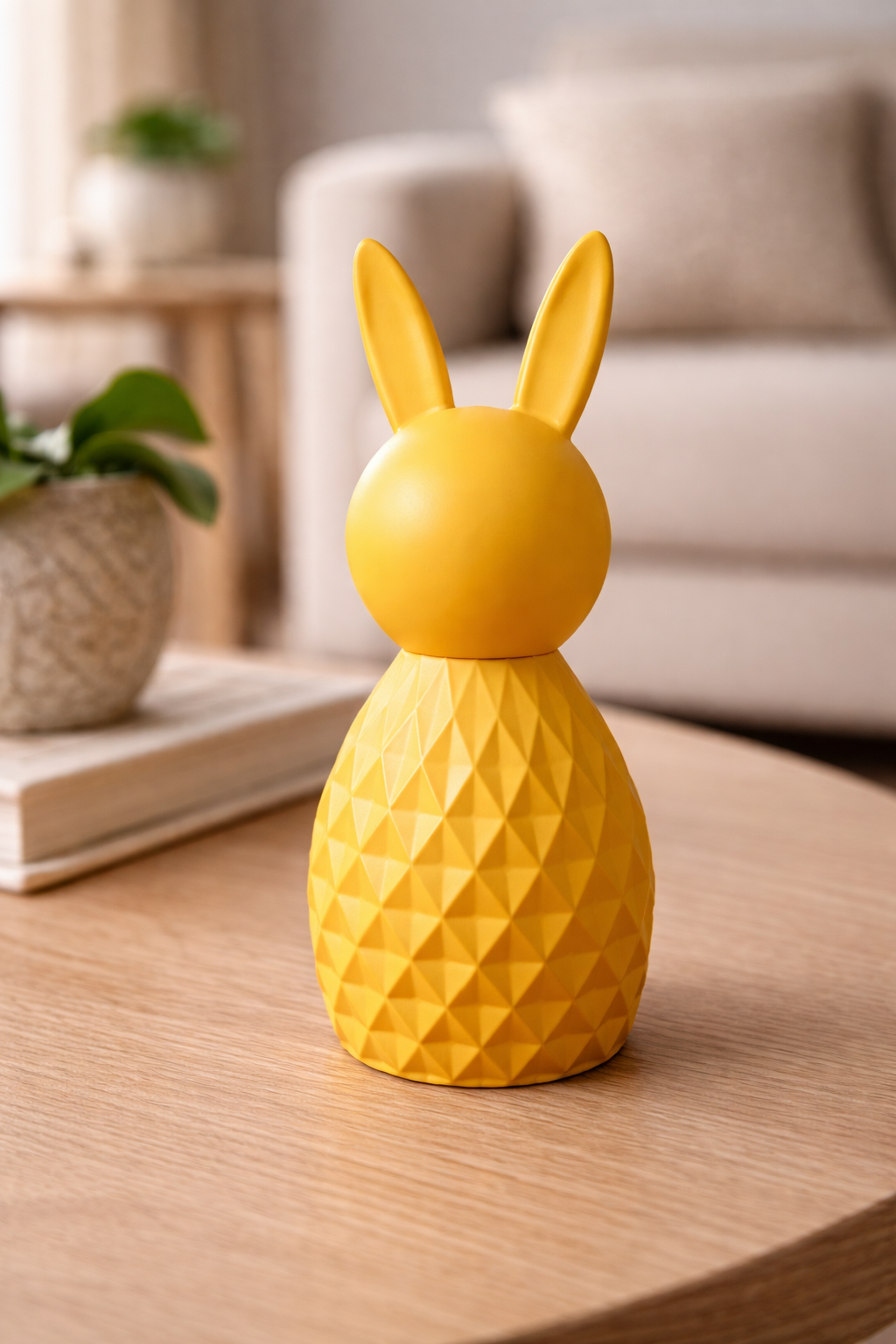 Denna eleganta påskhare är en stilren och dekorativ prydnad som snabbt blir en vacker detalj i hemmet. Med sin moderna form och geometriska struktur kombinerar den lekfull design med en exklusiv känsla, vilket gör den perfekt som säsongsdekoration – särskilt till påsken.