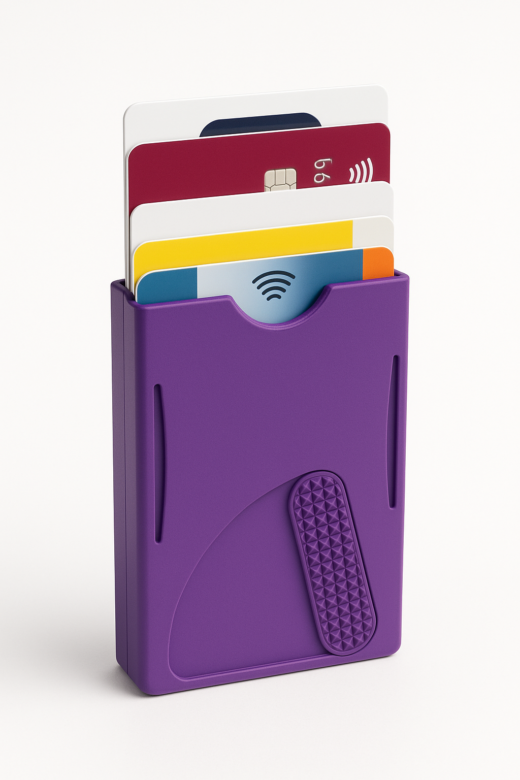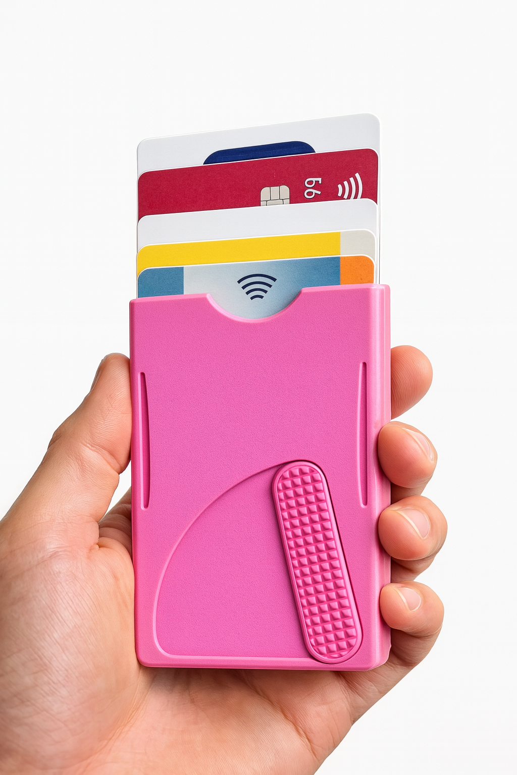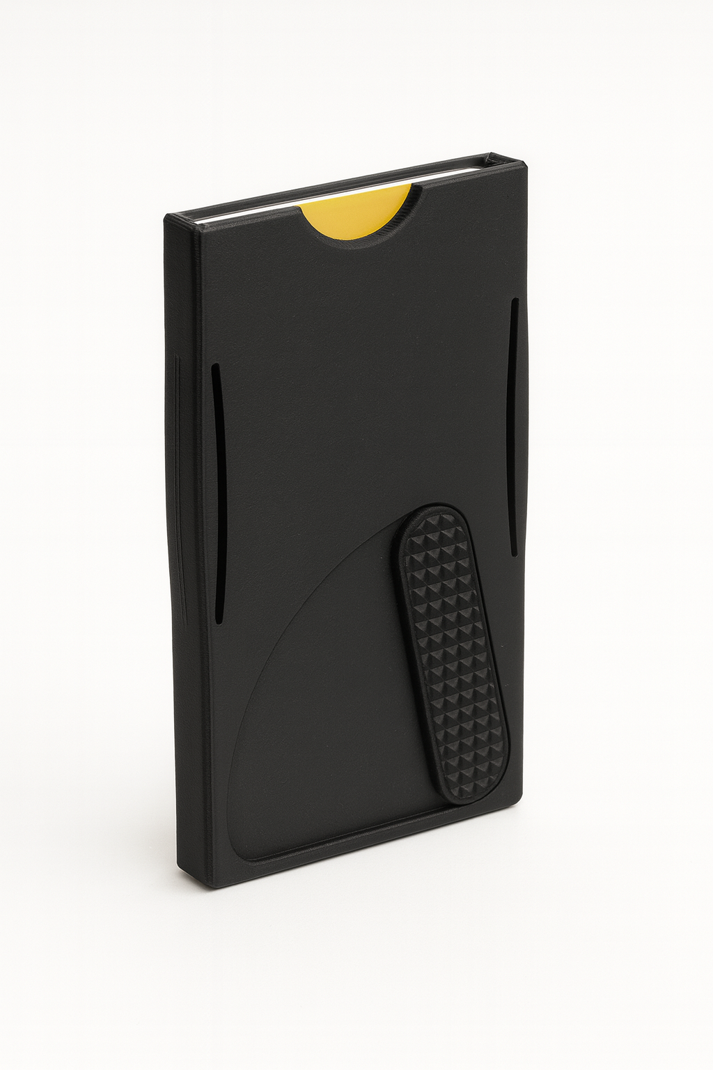 Korthållaren använder en front swipe-rörelse för att snabbt och enkelt trycka ut korten. Designen är print-in-place, vilket innebär att produkten kommer färdigmonterad och redo att användas direkt – efter en lätt initial frigöring av mekaniken genom att trycka och bända några gånger.